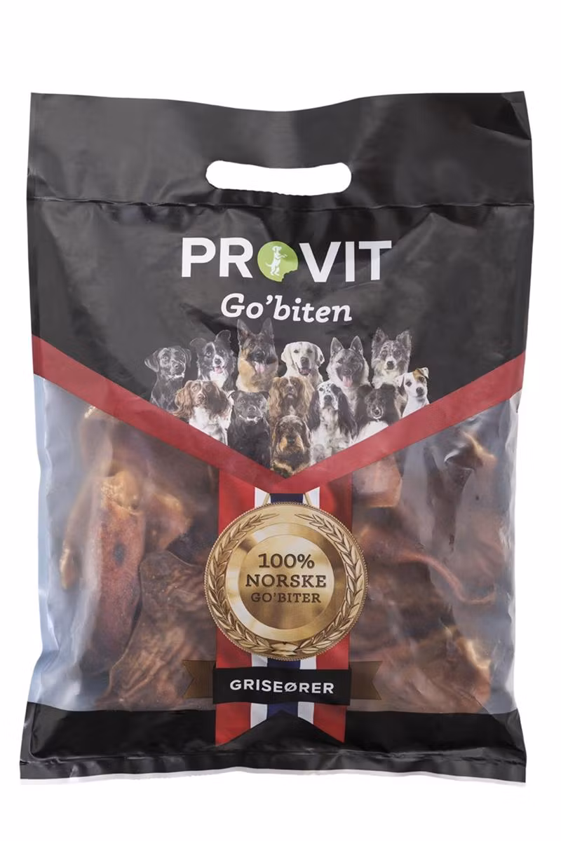 Provit Griseører av norsk gris, er et 100% naturlig tygg til hunden. Griseørene er lufttørket og uten noen form for tilsetningsstoffer. Provit Griseører er produsert i Norge fra norske råvarer, og er et 100% rent naturprodukt. Dette er et naturlig alternativ til behandlede tyggebein. Høy kvalitet på råvarer gir god smakelighet, derfor er dette et populært tygg til hunden. Griseører har kun 8% fett og kan derfor gis til hunden som ekstra kos, med god samvittighet.