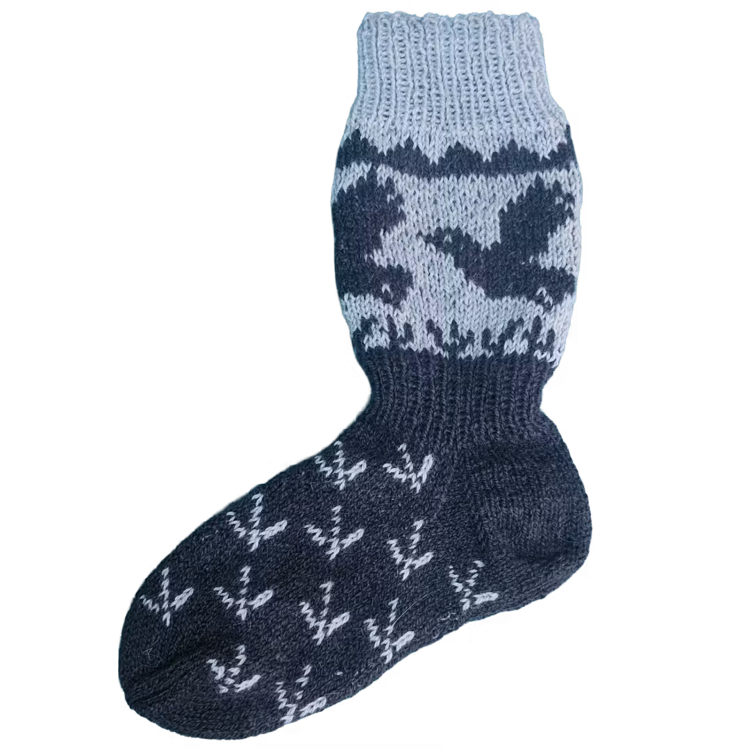 Disse sokkene strikkes i Rauma Vandre, et sokkegarn av 100 % norsk ull kjent for sin varme, styrke og naturlige elastisitet. Dette gir en sokk som tåler tøffe forhold, samtidig som den holder føttene tørre og lune gjennom hele turen. Rypesokken er derfor et trygt valg for både friluftsfolk og deg som bare vil ha en skikkelig god ullsokk i hverdagen. Mønsteret er designet av oss på Statland Vestre.