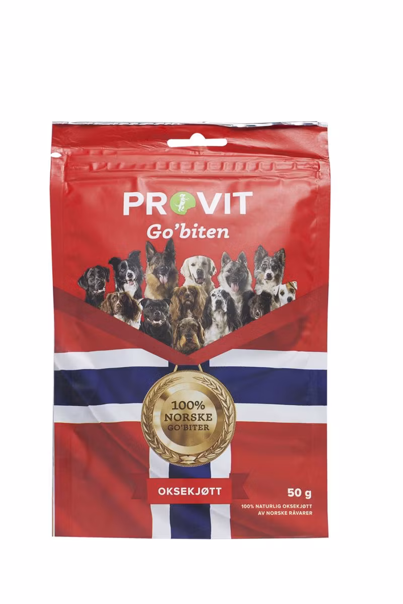 Provit Go’biten er laget av rene, norske naturprodukter uten kunstige tilsetninger. Godbitene inneholder kun frysetørket oksekjøtt fra norsk produksjon – en skånsom prosess som bevarer råvarens naturlige smak, aroma, vitaminer, mineraler og næringsstoffer. Resultatet er en smakfull og trygg godbit som hunder virkelig elsker.