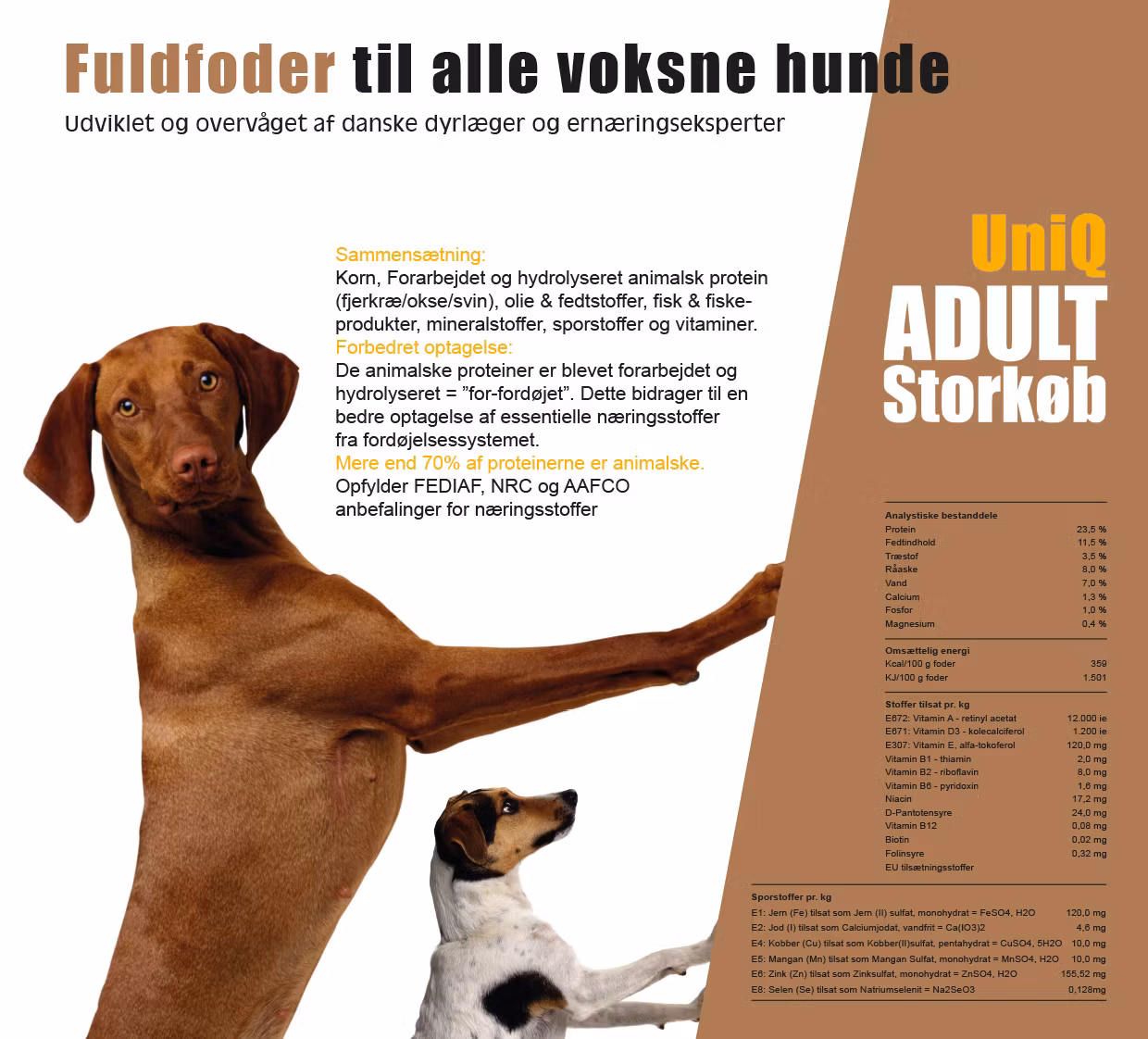UniQ Storkøp Adult er et komplett fullfôr utviklet for voksne hunder med normalt aktivitetsnivå. Dette er et stabilt og velfungerende hverdagsfôr som gir hunden den ernæringen den trenger for å holde seg sunn, i god form og med jevn energi gjennom dagen – uten å være et høyenergiprodukt.