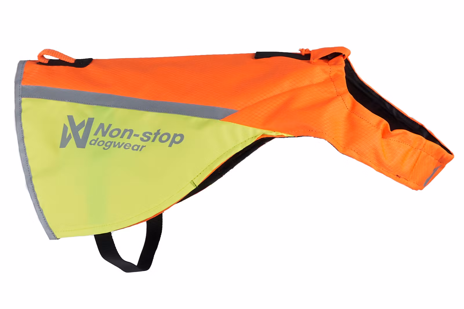 På den oransje modellen har vesten kontrastfargede røde og gule sidefelt som tydelig viser hvilken vei hunden er vendt. Dette er en viktig fordel i sporings- og jaktsituasjoner hvor rask retningsforståelse er avgjørende.