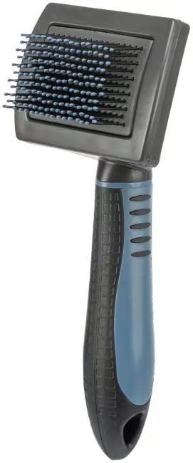 Myk karrebørste som er perfekt for skånsom pelspleie av små hunder og sensitive områder. De myke plastbustene med avrundede tupper fjerner løst hår og smuss uten å irritere huden. Børsten har et ergonomisk håndtak med gummigrep som gir god kontroll og komfort under bruk, noe som gjør daglig pelsstell enkelt og behagelig.