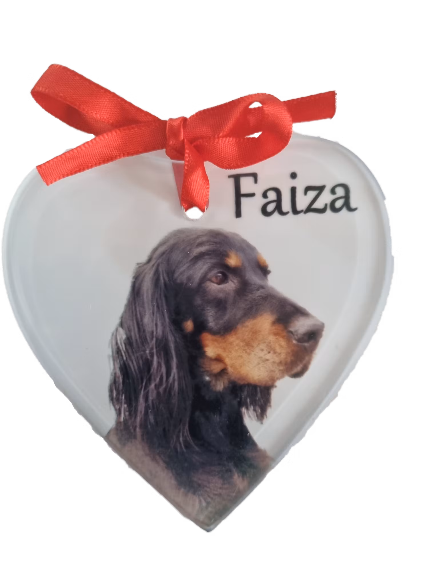 Hjerte er laget av herdet glass. Rødt bånd medfølger.
